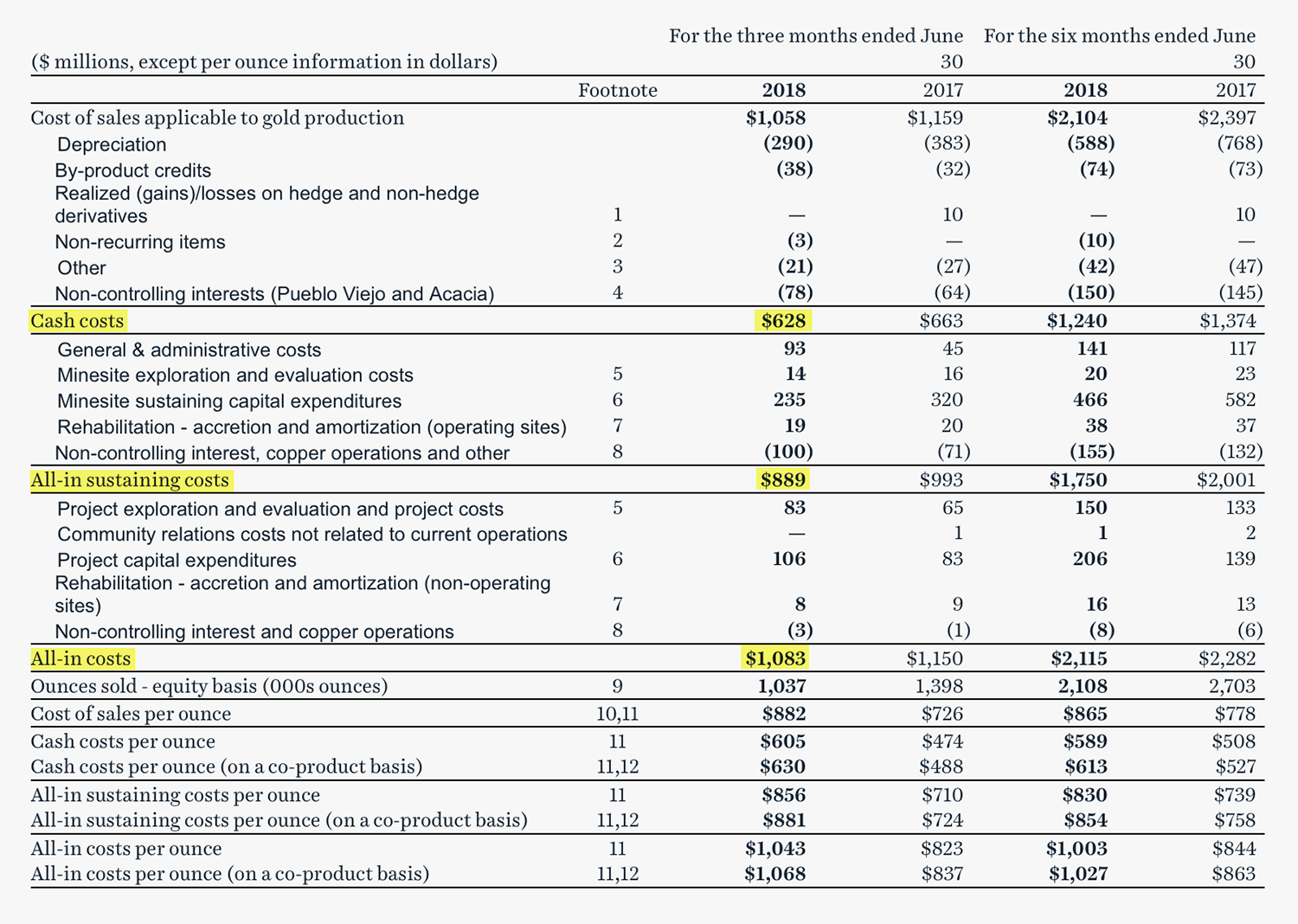 В таблице выше себестоимость производства Barrick составила 875 долларов — среднее значение за 1 полугодие 2018 года.