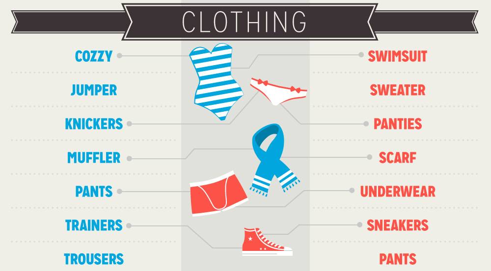 К примеру, британцы знают, что biscuits американцы называют cookies, а flat — apartment, но не многим известно, что такое alumnus (выпускник колледжа или университета) или fender (щиток от грязи над колесом автомобиля). В свою очередь, американцы знают, что yard (двор) в Британии называется garden, а truck (грузовик) — это lorry, но привычные для британцев слова plimsolls (кеды) или off-licence (винный магазин) ничего им не скажут.