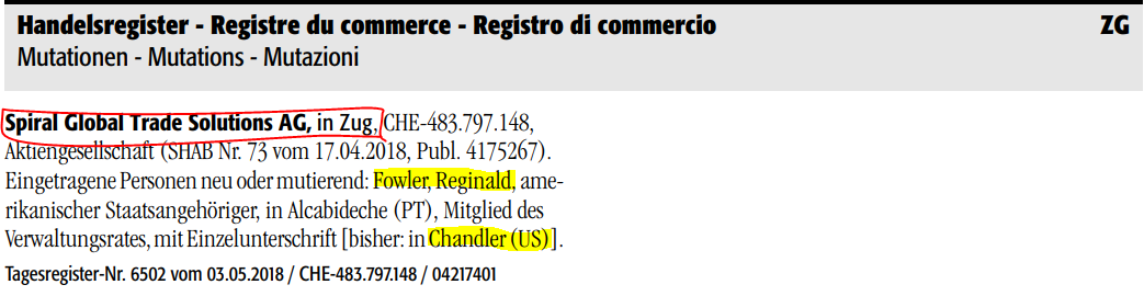 Как известно, в прошлом, Реджи Фулер возглавлял компанию Spiral Inc, которую основал ещё в 1989 году. Поэтому прямая связь Global Trading Solutions, LLC, Global Trade Solutions AG и Crypto Capital Corp более не оставляет никаких сомнений, потому что: