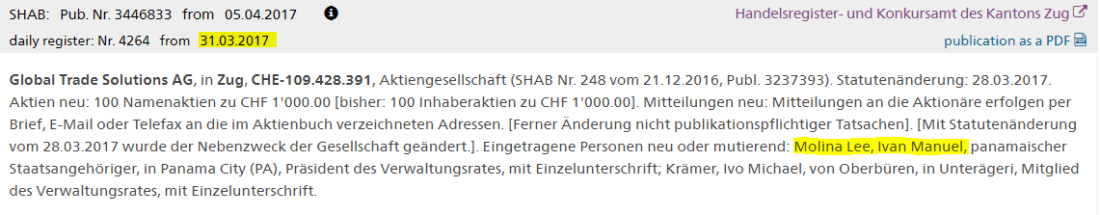 Сегодня материнской компанией Crypto Capital Corp является швейцарская Global Trade Solutions A.G, среди менеджмента которой находятся Eitan Treger, Amit Raz и Ivan Manuel Molina Lee: