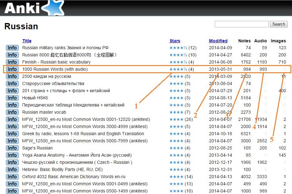 Перед нами открылся список доступных колод данного раздела. Колод очень много, есть полезные, есть совсем не нужные. Давайте скачаем колоду «1000 Russian Words (with audio)». Что означают все эти столбцы: