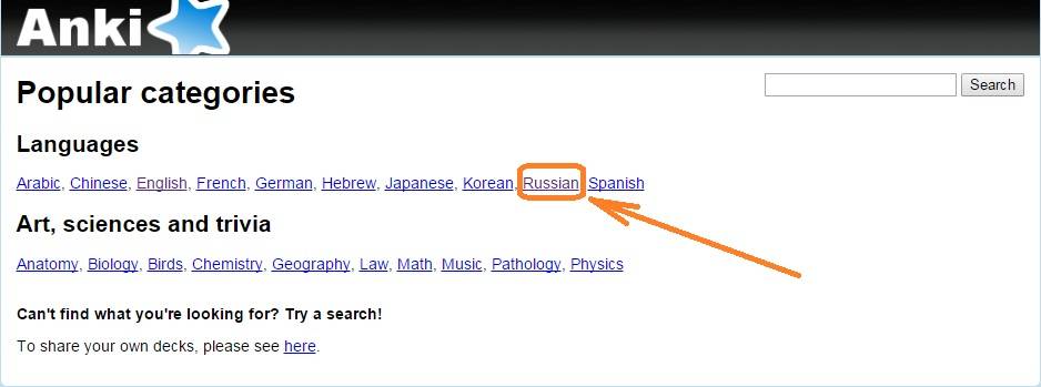 Есть две больших категории: «языки (languages)» и «искусство, науки и общая информация (arts, sciences and trivia). Так как мы заинтересованы в пополнении своего словарного запаса, то давайте зайдем в раздел «Russian» из категории «Languages».
