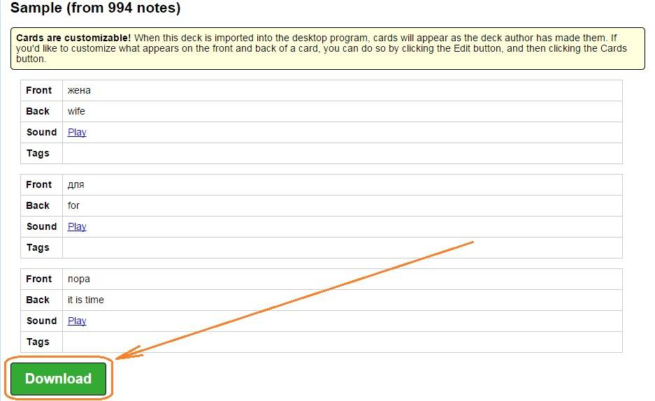 Для того, чтобы скачать колоду, нажимаем «Info». Отрывается информация о колоде. Здесь можно прочитать описание колоды и просмотреть пример карточек. Для того, чтобы скачать колоду, нажимаем «Download». После того, как колода загрузится, просто нажмите на нее два раза, и она автоматически импортируется в программу Anki.