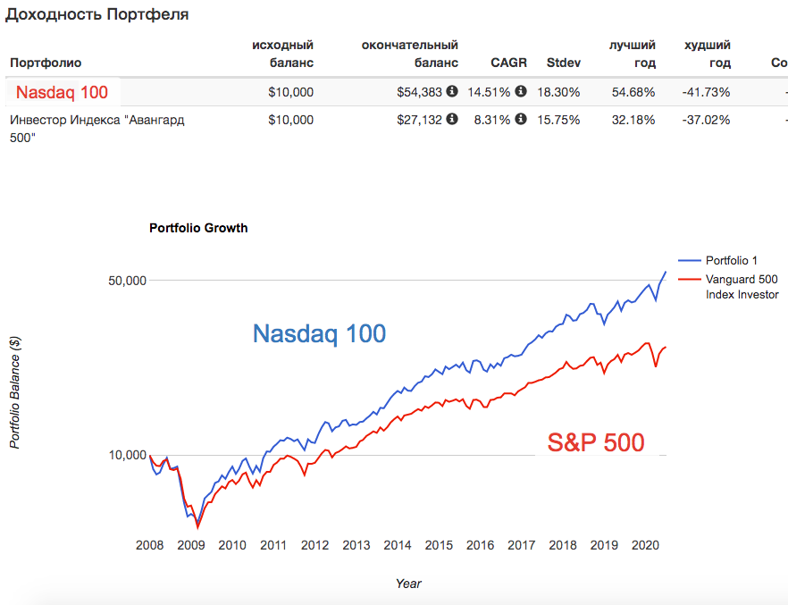 Если мы возьмем данные с начала кризиса 2008 года, то Nasdaq показывает просто феноменальный рост. Намного опережая конкурента. Среднегодовая доходность Nasdaq 100 — 14,51% против 8,31% у индекса S&P 500.