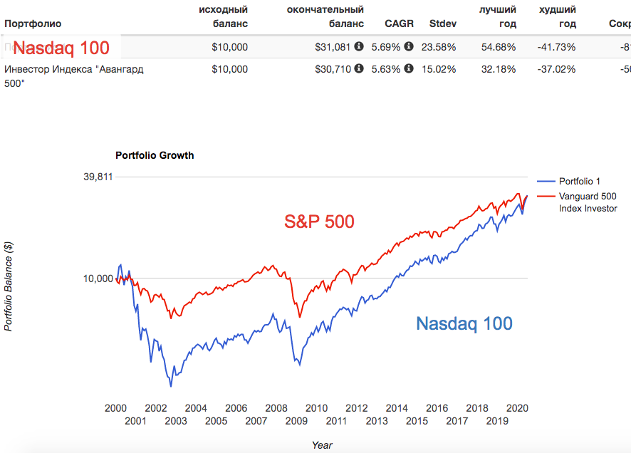 Среднегодовые доходности примерно равны. Но в тоже время максимальная просадка по индексу Nasdaq составляла 81% (ЖЕСТЬ), против 50% у S&P 500. Показатель волатильности у Nasdaq на 50% выше (а это не есть гуд).