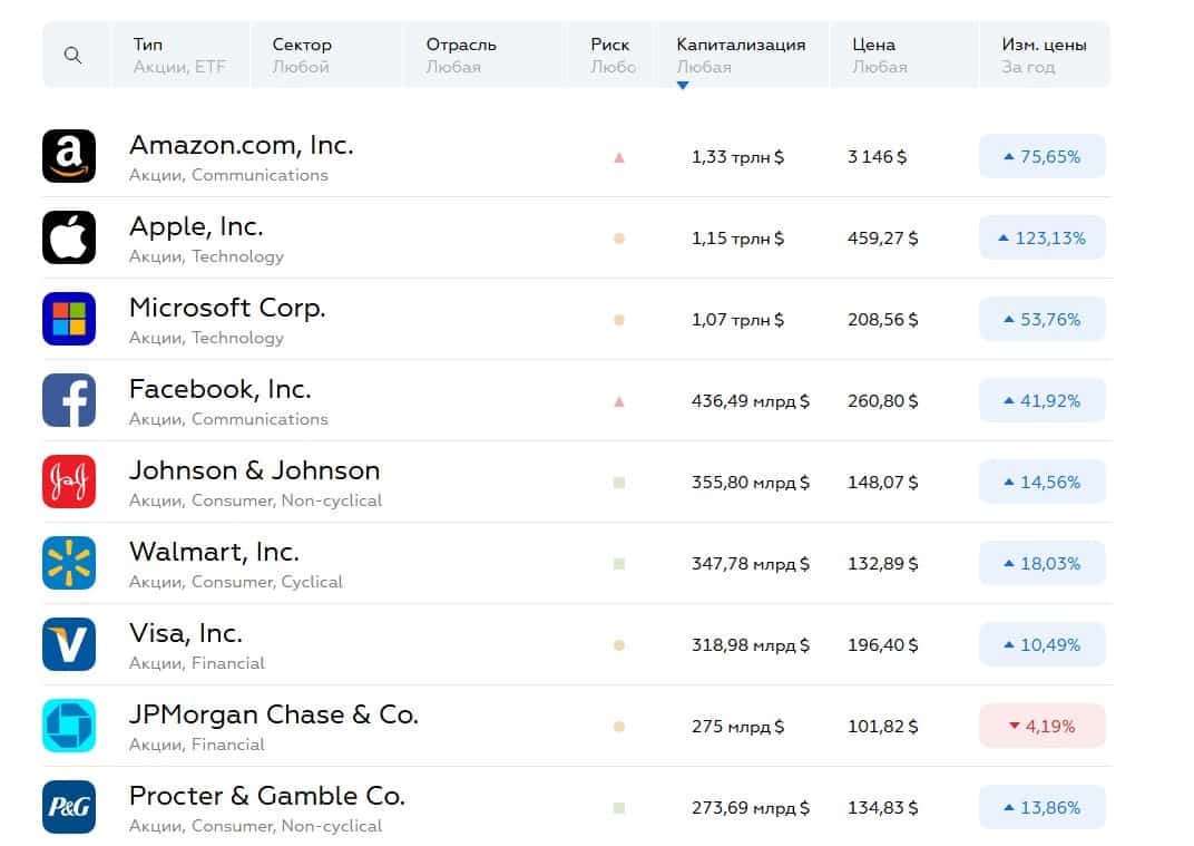 В числе акций, которые предлагает к покупке United Traders, такие известные компании как Amazon, Apple, Microsoft, Facebook, Visa, Johnson & Johnson и другие.