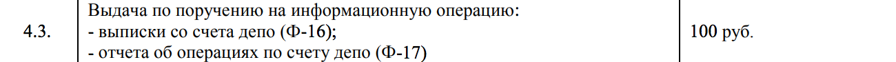 Тариф депозитария Брокера-1 на получение выписки. 100 Р за одно наименование бумаги
