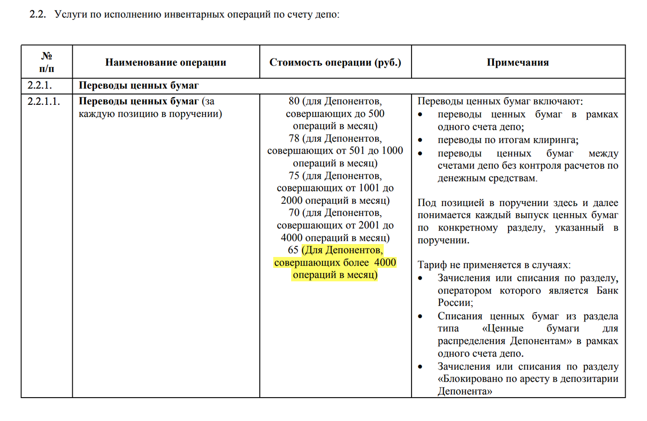 Тариф депозитария Брокера-2 за прием ценных бумаг. 65 Р за одно наименование, если в месяц совершать более 4000 операций, — мой случай