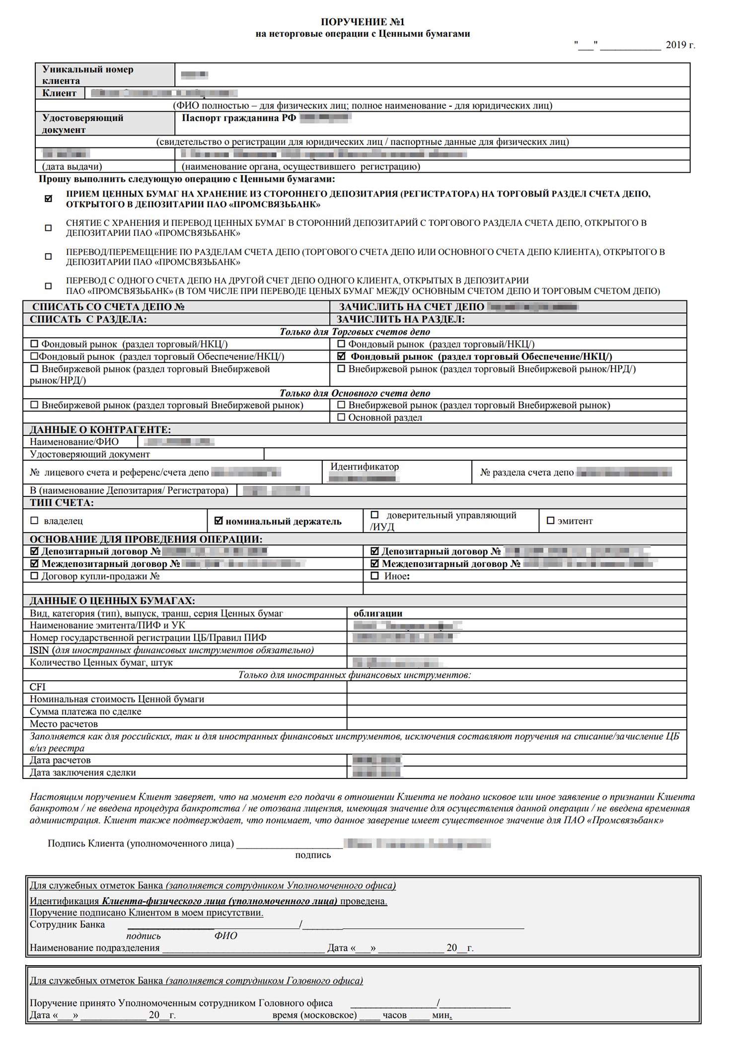 После того как я подал поручение на вывод ценных бумаг Брокеру-1 и он принял его к исполнению, мне нужно было подать аналогичное поручение Брокеру-2, но уже на ввод ценных бумаг. Личного кабинета у Брокера-2 не было — брокер подготовил мне все бумаги самостоятельно, запросив предварительно следующие данные: