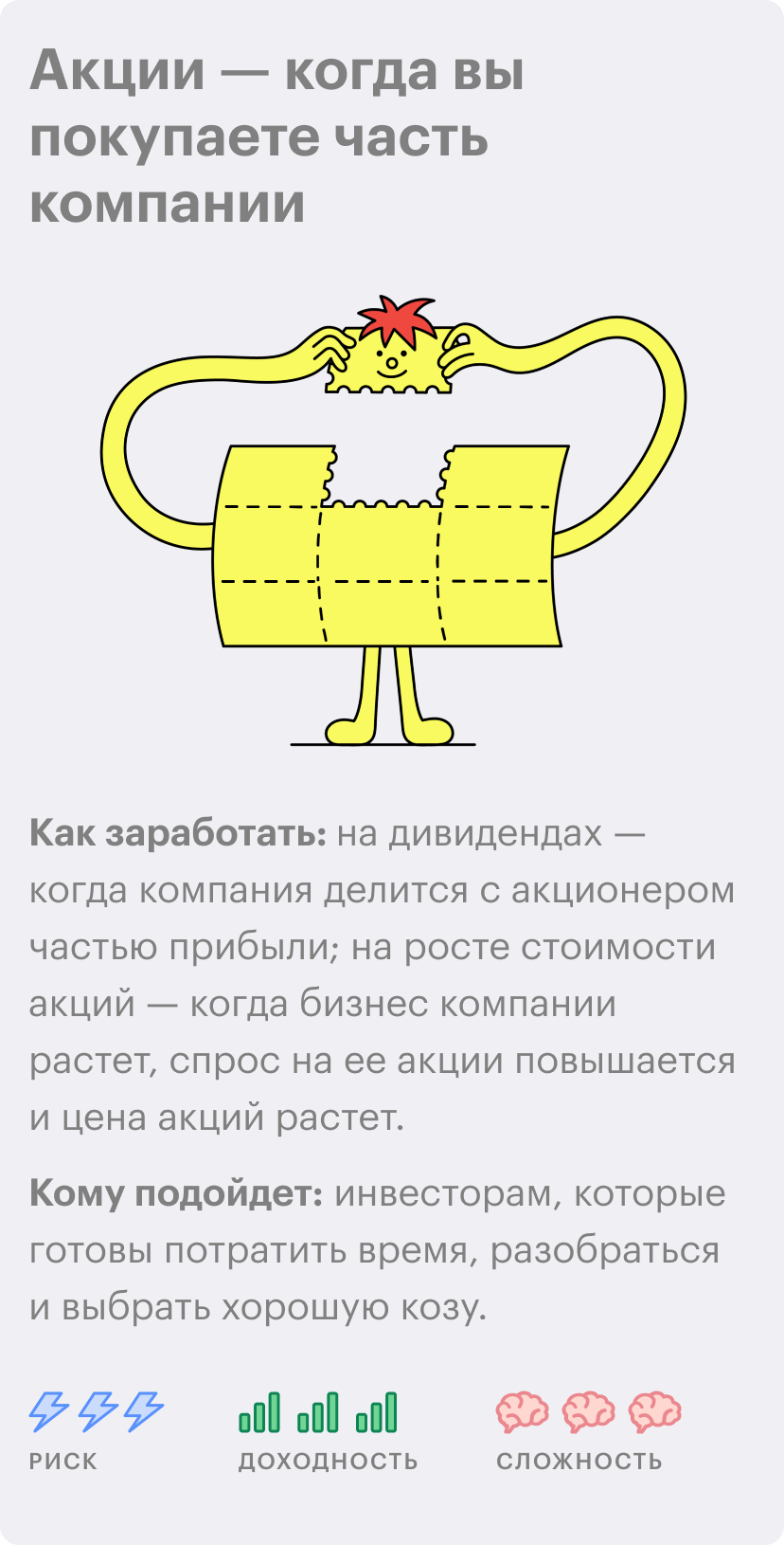 Акция — это часть компании, доля в ее бизнесе. Если вы купили акцию, то фактически стали совладельцем компании и можете претендовать на часть ее прибыли.