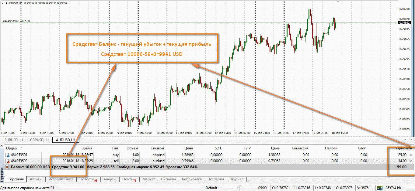 Как видно, баланс на момент открытия сделок составлял 10 000 USD. На данном счету открыто две сделки: покупка по GBP/USD лотом 1, и продажа по AUD/USD лотом 2. Видно, что прибыли по позициям нет, а убытки суммарно составляют –25 – 34 = –59 USD. Вычисляем доступные (свободные) средства