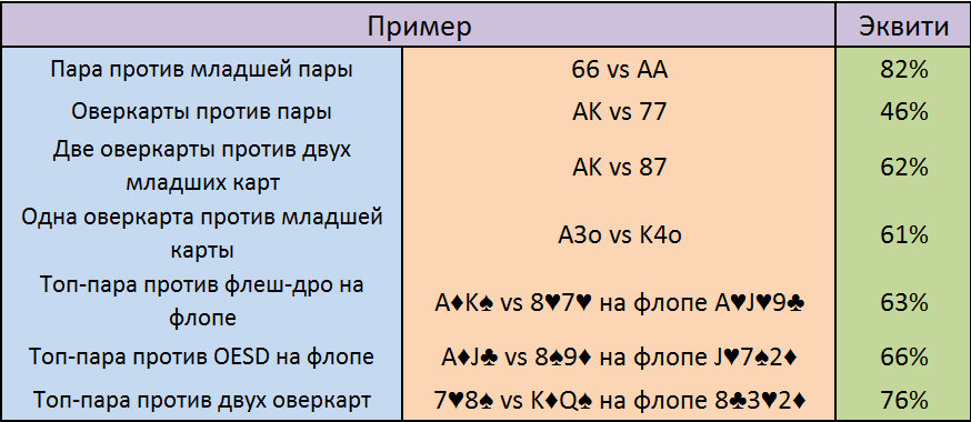 Эквити зависит от того, как хорошо вы или соперник «попадаете» в общие карты, оно меняется по ходу раздачи. Для упрощения и наглядности рассмотрим олл-ин на префлопе, не затрагивая раунды торгов.