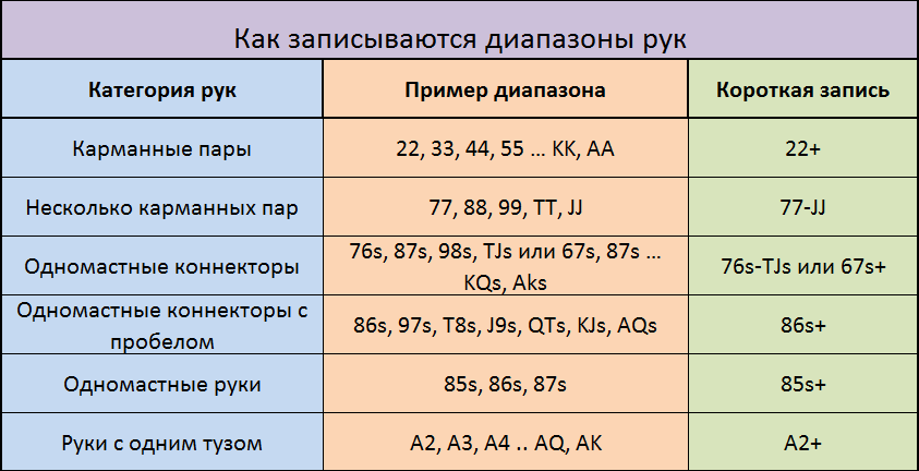 Согласно вышеописанному примеру, Вы имеете на руках Туз-Король и считаете, что противник сделал ставку также с сильной рукой. Вы не можете знать его карты, но предполагаете, что у него Туз-Король, Туз-Дама или Туз-Валет. Данное предположение Вы сделали исходя их размера его ставки, позиции и благодаря наблюдениям за ним в предыдущих раздачах или благодаря покерным программам, которые предоставили статистику на игрока – показали диапазон его стартовых рук для данной позиции. Таким образом, Вам нужно рассчитать, какое Эквити имеет диапазон соперника, состоящий из карт «Туз-Король, Туз-Дама и Туз-Валет»