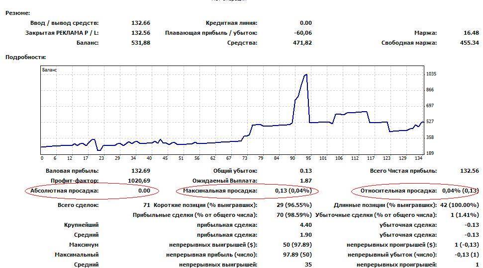 Следует обратить внимание, что абсолютная просадка в этом случае равна нулю. Таким образом, максимальная просадка определяет реальный размер рисков от торговли