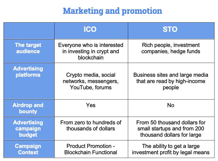 ICO. Целевая аудитория ICO-проектов, как правило, зависит от стадии краудсейла:- Private Sale — аккредитованные инвесторы и бизнес-ангелы. Есть существенные барьеры в виде минимального размера инвестиций — от 20 до 1000 тысяч долларов.- Pre-ICO, или Pre-Sale — обычно расчет идет на крупных инвесторов. Чтобы стать участником, нужно записаться в whitelist до запуска краудсейла. Ограничения на размер минимальных инвестиций есть, но меньше, чем во время Private Sale.- Main Sale — рассчитан на всех желающих. Если организаторы уверены в успехе проекта, список участников ограничивается успевшими записаться в whitelist. STO. Целевая аудитория security token offerings — аккредитованные инвесторы — частные лица, которые отвечают одному из следующих критериев:- личный доход — от 200 тыс. долларов в год, семейный — от 300 тыс. за последние два года;- размер чистых активов — от 1 миллиона долларов;- занимают должность генерального, исполнительного или просто директора в компании-эмитента.