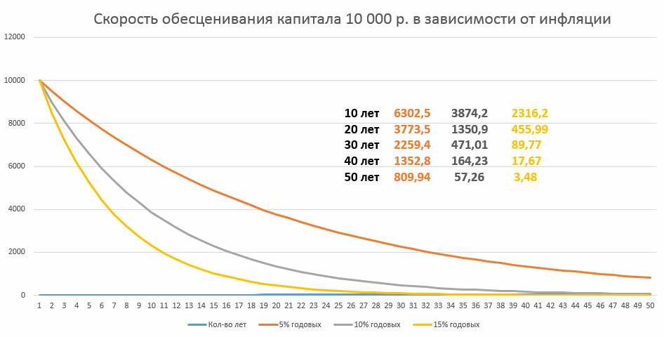 При этом понятно, что чем больше величина инфляции, тем быстрее обесцениваются деньги. Посмотрим на такую картинку: