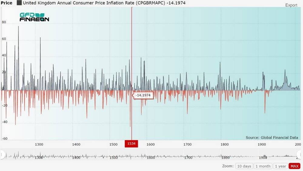 Здесь уже есть улучшенная возможность сопоставить инфляционные пики конкретным годам — и как можно видеть, самые высокие из них приходятся как раз на войны:
