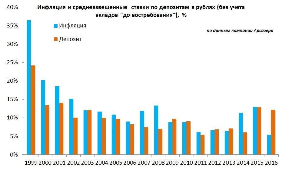 В то же время при высокой инфляции на уровне 15% в год всего через 5 лет от денег остается лишь половина их изначальной стоимости. Ставки по банковским депозитам примерно равны инфляции и в отдельные годы могут даже ее обгонять, однако на длинных дистанциях последней удается «отъесть» и от депозитов некоторую часть капитала.