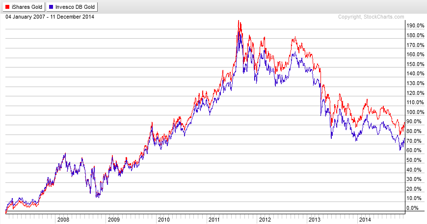 Поэтому инвесторам в ETF фонды на золото нужно быть внимательными: существуют ETF, которые отслеживают спотовую цену золота, обладая физическими запасами металла. Примерами таких фондов являются IAU или GLD. И это предпочтительный вариант инвестирования, поскольку с другой стороны есть, например, синтетический фонд DGL, который работает через фьючерсы. Сравнение IAU и DGL показывает, что за 7 лет инвестирования преимущество первого составило примерно 8.5%, т.е. более чем 1% в год: