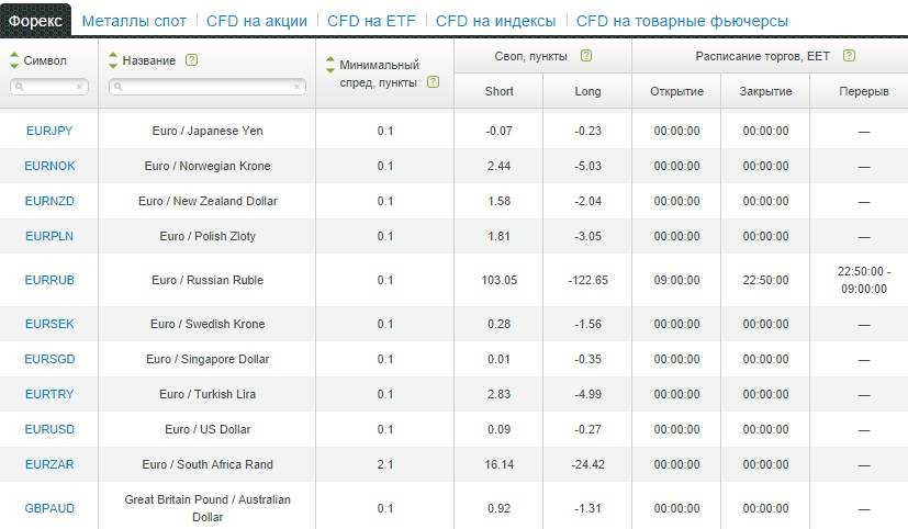 Размер свопов в таблице указан в пунктах и рассчитывается индивидуально для каждой пары. Свопы для сделок, открытых на покупку (buy), показаны в столбике Long, соответственно, на продажу (sell) Short. Если перед значением стоит знак минус, то своп отрицательный. Уже из данного скрина видно, что самый большой положительный своп начисляется по паре евро\рубль. На этой ноте перехожу к обещанной инвестиционной идее.