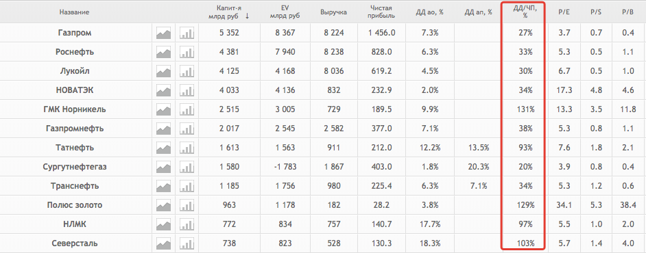 Например, компании с капитализацией больше $200 млрд., у которых уровень дивидендных выплат на данный момент более 90%.