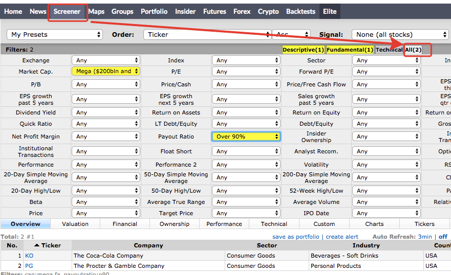 Во вкладке Screener. Нажимаем кнопку «All». Ищем поле «Payout Ratio». Задаем необходимый коэффициент (больше-меньше определенного процента).