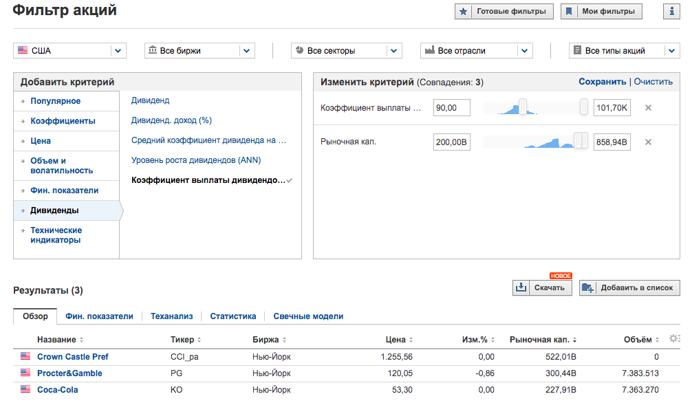 Идем на инвестинг ком. Можно искать и российские компании в том числе. Нам нужен фильтр акций (ссылка). Повторим аналогичные настройки. И получаем практически аналогичный результат.