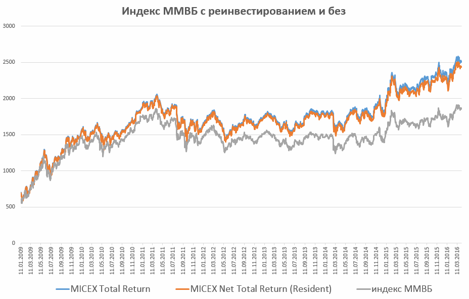 Как видно, до последнего времени дивиденды компаний в индексе находились лишь на уровне 1-3% годовых, что соответствует проценту в Европе и Америке — при значительно более сильной инфляции в России. Но кажется, ситуация меняется в лучшую сторону. На сайте Московской бирже можно найти график полной доходности индекса ММВБ с 2009 года, где дивиденды реинвестированы (синяя линия):