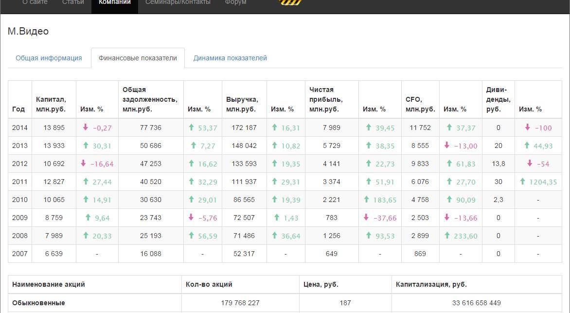 На сайте cfocom.ru представлены основные показатели наиболее известных компаний на фондовом рынке. Удобный сайт, хотя и малоизвестный, если лень заглядывать в ежегодную отчетность компаний по МСФО. Приведу примеры, какие компании на текущий момент показывают наилучшие результаты. Это М.Видео, Дикси, Э.ОН Россия, Черкизово, Московская Биржа, Магнит (в настоящий момент сильно переоценена).