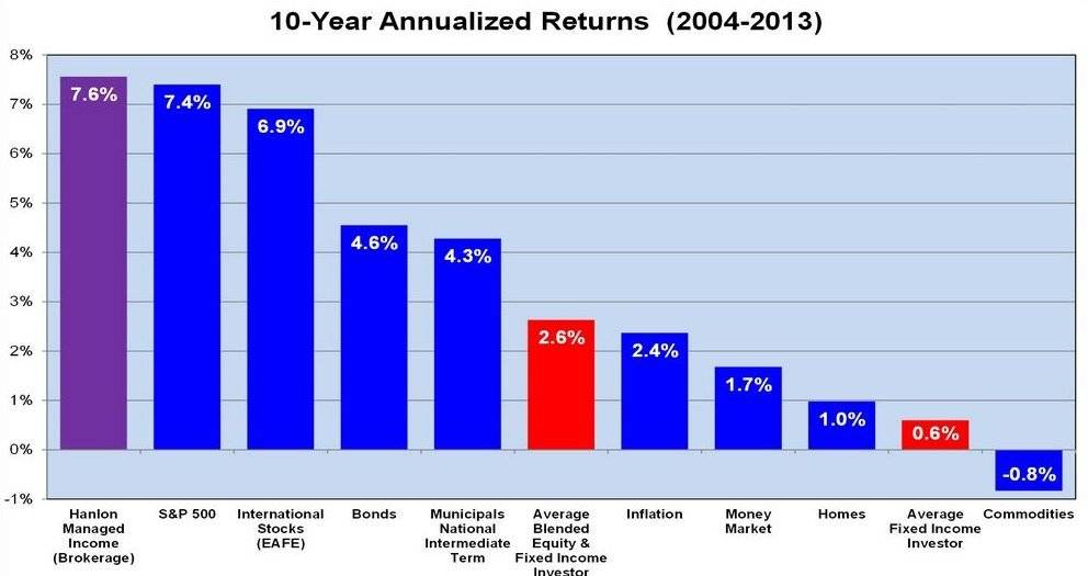 Если же брать полностью зафиксированный доход, то он оказывается и вовсе на уровне 0.6% — т.е. такой инвестиционный доход уступает даже инфляции! Причем по статистике не с 2004, а с 1993 года разница увеличится еще больше — акции американского рынка дали за этот период в среднем 8.2%, а средний доход инвестора составил 2.3% (доходность золота обусловлена резким взлетом в 2001-2011 годах — однако по факту золото это товарный актив, мало отличающийся от, например, пшеницы. По выражению Баффета, золото ничего не производит, хотя свои достоинства у него все же есть).