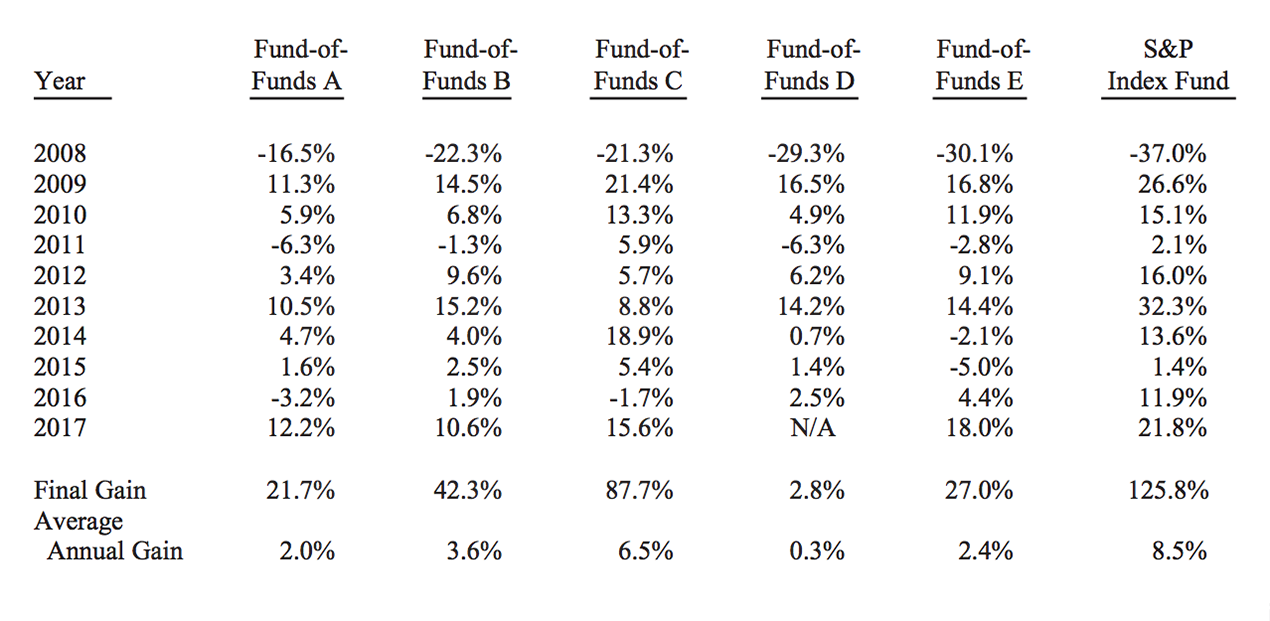 Protégé Partners выбрал пять фондов, а те распределили вложения примерно между двумя сотнями хедж-фондов под управлением опытных специалистов. Их задачей было показать доходность за период с 2008 по 2017 год выше, чем дал бы индексный фонд S&P 500.
