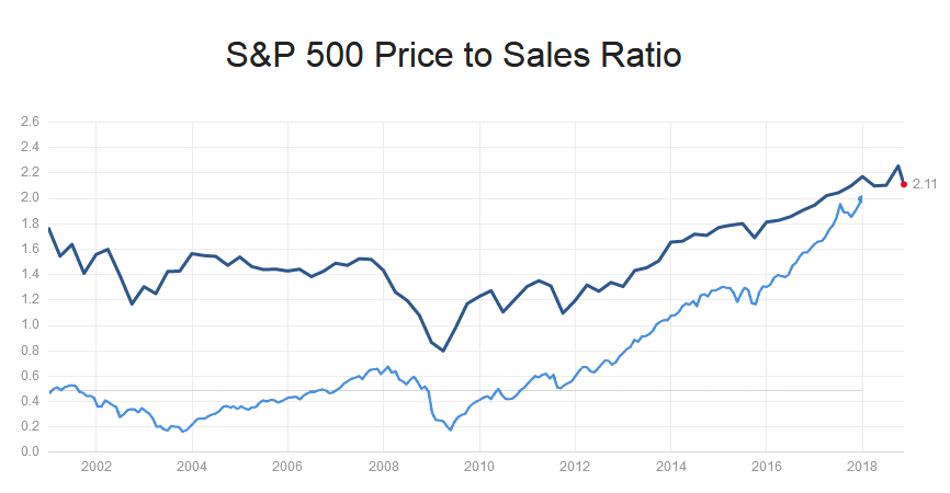 Рассмотрим теперь американский рынок. На сайте http://www.multpl.com/s-p-500-price-to-sales представлено значение Price to Sales Ratio для американского индекса с начала века. На него я дополнительно наложил котировки американского индекса с учетом реинвестирования дивидендов (нижний график):