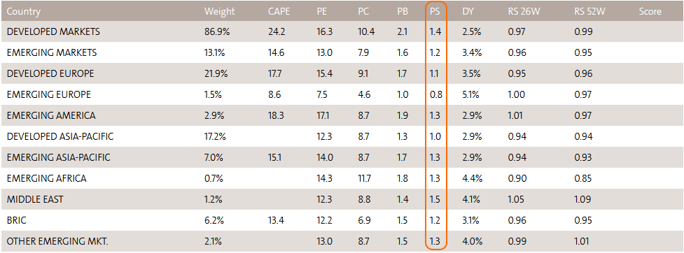 Что видно здесь? Во-первых, заметна очень сильная корреляция кривых — просадка индекса S&P500 в 2002-2003 и 2008-2009 годах приводила к соответствующему падению значений P/S. Во-вторых видно, что последний кризис начался при значении коэффициента около 1.5, тогда как повторение этого значения в 2013 году о кризисе не свидетельствовало. Инвесторы, либо вышедшие из американского рынка к этому времени, либо воздержавшиеся от инвестирования, упустили бы хорошую прибыль следующих пяти лет. Текущие значения P/S для других стран и рынков можно посмотреть .