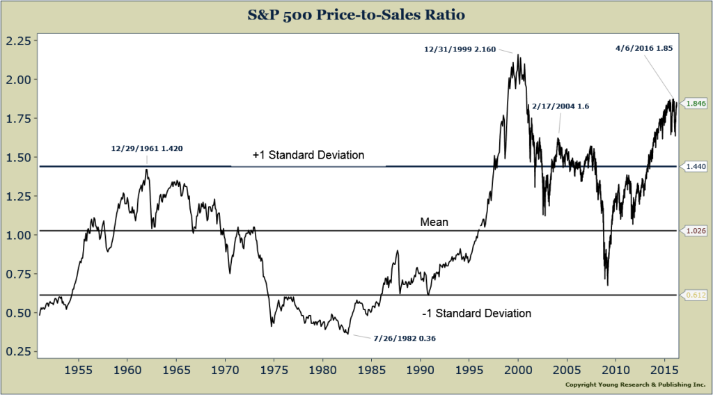 Из графика следует, что хотя среднее значение коэффициента равно единице, в разные временные интервалы оно означало разную оценку акций. Так, в начале 70-х годов при P/S = 1 произошел мощный кризис с сильным падением акций и двузначной инфляцией конца 1970-х. При этом то же значение коэффициента было лишь кратковременно повторено в кризис 2008-2009 года — время, когда следовало покупать просевшие акции.