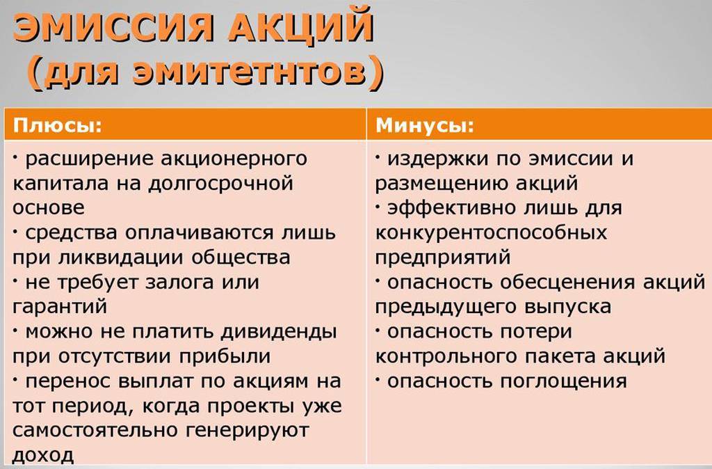 Процедура эмиссии на само предприятие окажет влияние как положительного, так и отрицательного характера. Преимущества эмиссии:
