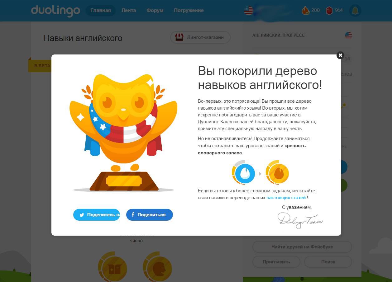 Еще от Duolingo не стоит ожидать быстрого прогресса. Если вы учитесь только по Duolingo, изучения языка затянется надолго. Один из пользователей сервиса запостил в «ВКонтакте» такой скриншот: