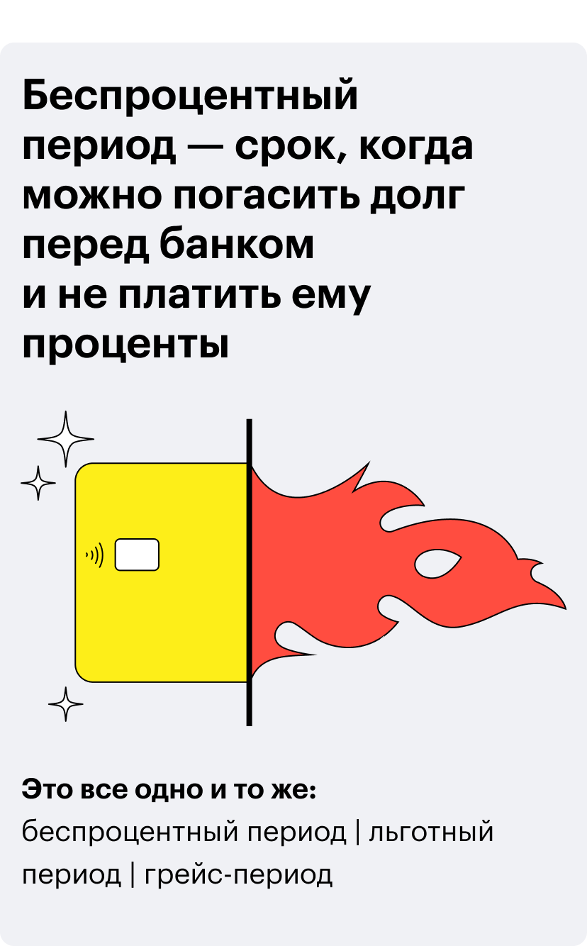 Беспроцентный период иногда называют грейс-периодом и льготным периодом — это одно и то же. Он есть почти у всех кредитных карт, но отличается: где-то до 50 дней, где-то до 100. И вообще, в нем много тонкостей и нюансов, которые нужно знать. Поэтому про беспроцентный период расскажем в отдельном уроке.