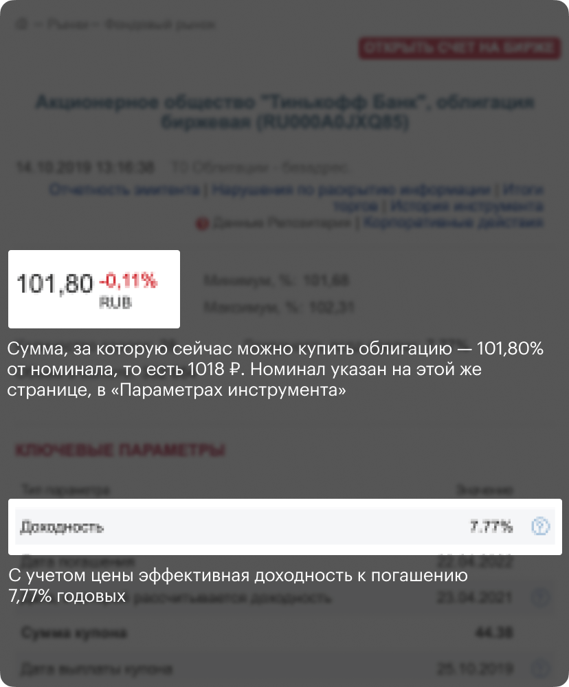 Страница облигации Тинькофф-банка на сайте Мосбиржи. В левом верхнем углу указано, за какую сумму сейчас можно купить эту облигацию — 101,80% от номинала, то есть за 1018 Р. С учетом цены эффективная доходность к погашению — 7,77% годовых, как показано в первой строке таблицы «Ключевые параметры»