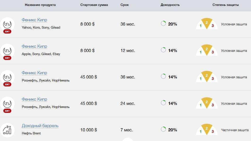 Актуальный список предложений здесь: http://broker.ru/sp. В списке выше представлены акции известных мировых и российских компаний, нефть; всего вариантов достаточно много. В структурные продукты часто зашиты невидимые инвестору комиссии, а риски этих продуктов как правило принижаются компанией — особенно в тех случаях, когда речь идет о достаточно высокой доходности. И именно со структурным продуктом Брокеркредитсервиса приключилась весьма неприятная для компании история, прочитать о которой можно здесь.
