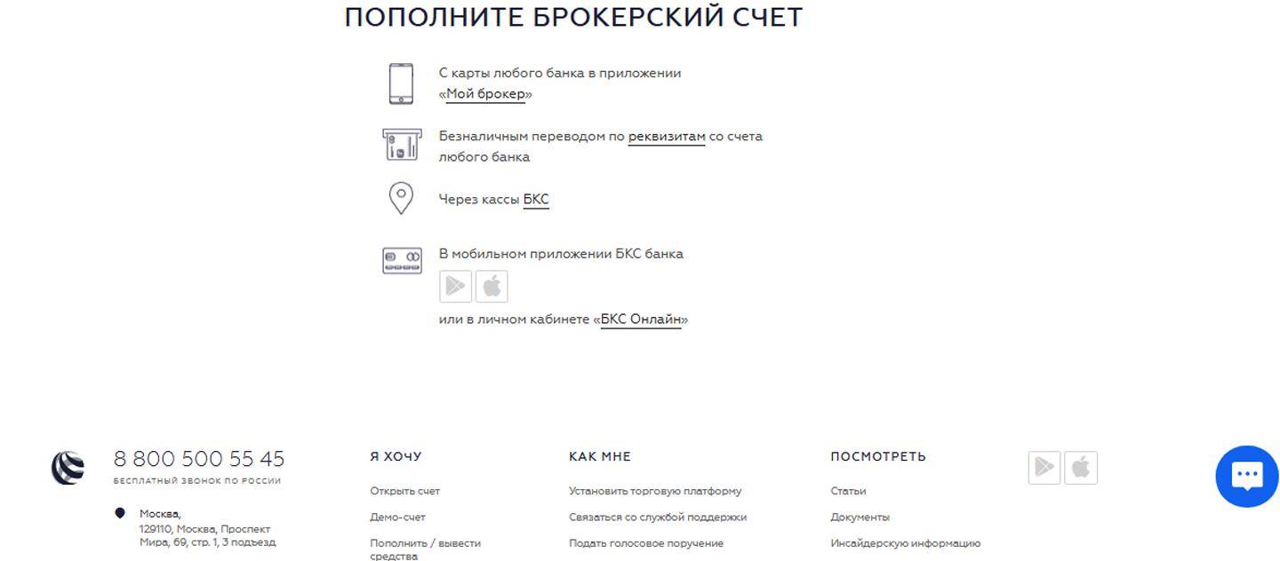 БКС не поддерживает расчёты ни через одну из популярных электронных платёжных систем. Основных вариантов пополнения депозита всего 3: