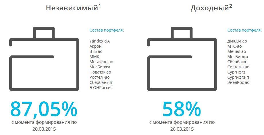Еще один продукт компании — это модельные портфели, составленные из акций российского рынка. К высокой доходности, которую так любят указывать брокеры, инвестору нужно относиться следующим образом. Высокая доходность (т.е. выше средней по рынку, в случае российских акций — выше индекса ММВБ) означает, что определенный потенциал роста у компаний уже израсходован; это не значит, что они не смогут расти далее, но вероятность этого с последующим ростом будет все меньше и меньше.
