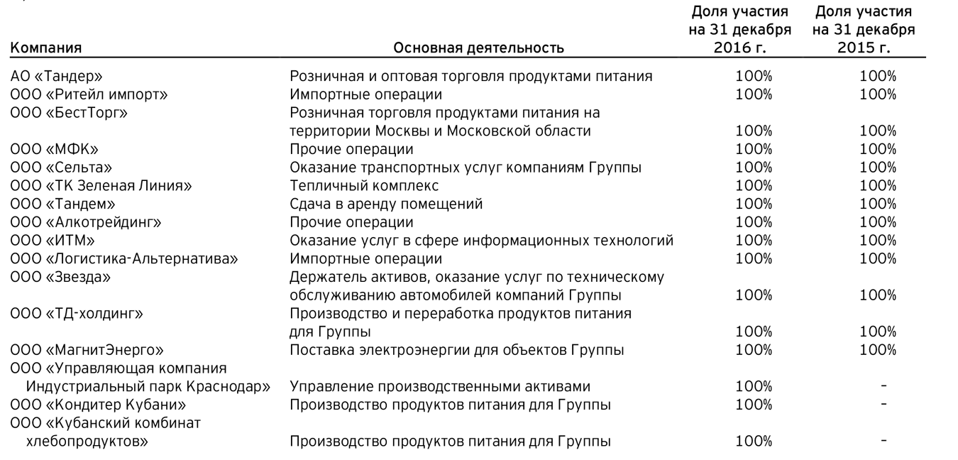 Это полный список компаний, входящих в группу «Магнит». Среди них есть, например, «Тандер», основная деятельность которого — это розничная торговля. Все они и принесли ту скрытую прибыль и выручку, которую мы видим в РСБУ-отчете.