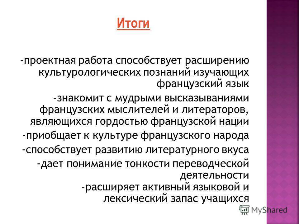 -проектная работа способствует расширению культурологических познаний изучающих французский язык -знакомит с мудрыми высказываниями французских мыслителей и литераторов, являющихся гордостью французской нации -приобщает к культуре французского народа -способствует развитию литературного вкуса -дает понимание тонкости переводческой деятельности -расширяет активный языковой и лексический запас учащихся