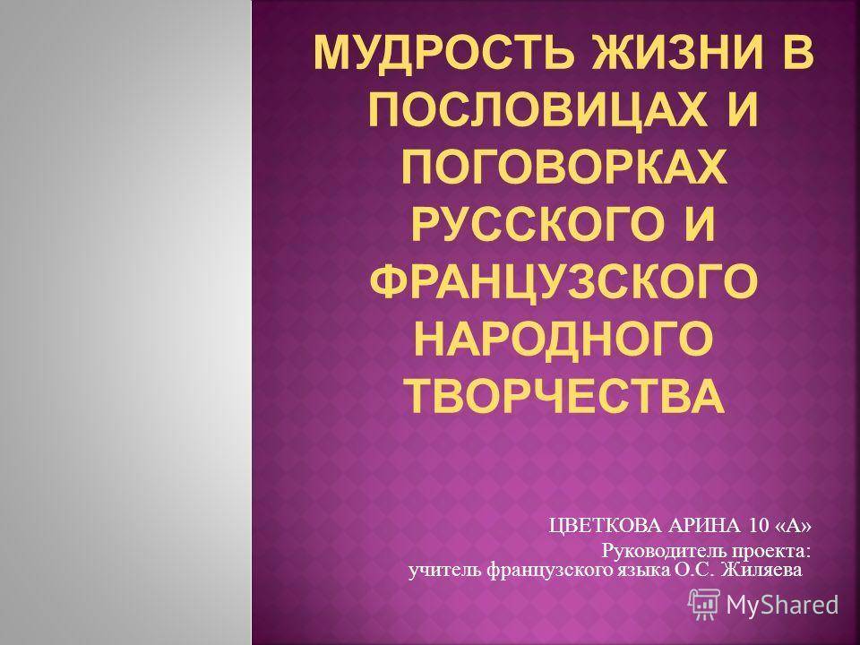 ЦВЕТКОВА АРИНА 10 «А» Руководитель проекта: учитель французского языка О.С. Жиляева МУДРОСТЬ ЖИЗНИ В ПОСЛОВИЦАХ И ПОГОВОРКАХ РУССКОГО И ФРАНЦУЗСКОГО НАРОДНОГО ТВОРЧЕСТВА