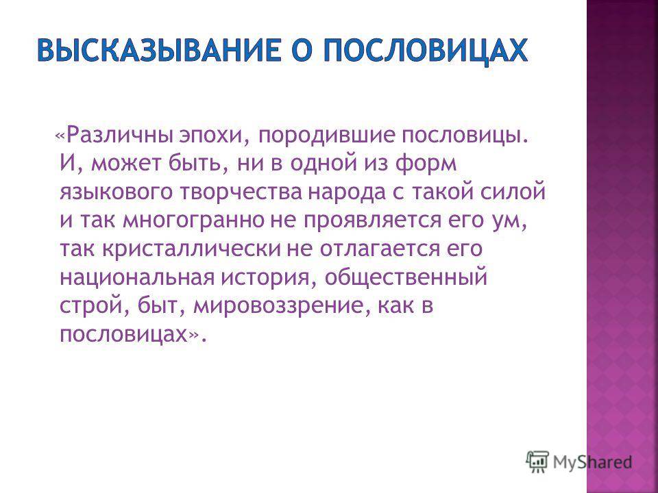 «Различны эпохи, породившие пословицы. И, может быть, ни в одной из форм языкового творчества народа с такой силой и так многогранно не проявляется его ум, так кристаллически не отлагается его национальная история, общественный строй, быт, мировоззрение, как в пословицах».