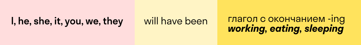 Чтобы правильно сформировать утвердительное предложения, в первую очередь нам потребуется подлежащее, после него идет will, затем have, be (неправильный глагол – been) и основной глагол в -ing форме.