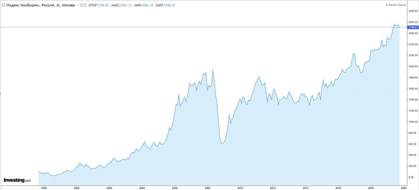 - Высокая вероятность получения дохода на продолжительных (от года) промежутках времени в случае долгосрочного инвестирования. На таких периодах рынки, как правило, растут. Исключение — периоды мировых кризисов. Но и это для инвестора плюс — покупка акций по более низким ценам.