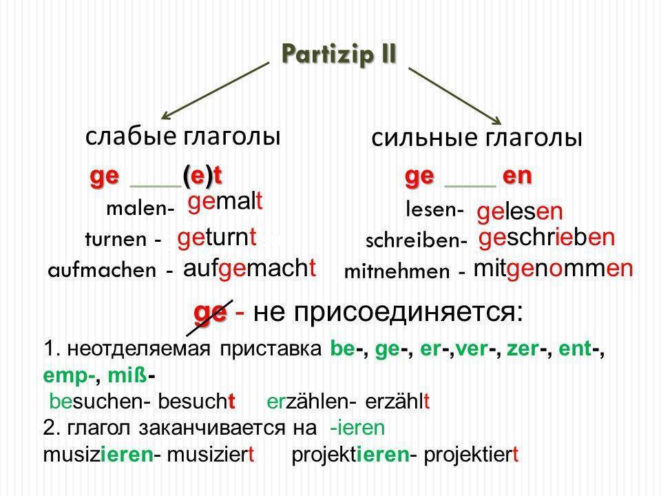 Прошедшее время образуется при помощи вспомогательного глагола haben/sein и причастия прошедшего времени, известного всем школьникам как Partizip II. У слабых и сильных глаголов оно образуется по-разному.