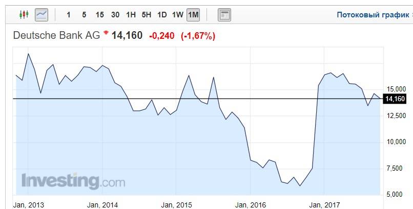 - Банковское дело и биржевые сделки. Здесь слабым местом является Deutsche Bank. В банкротство такой «махины» никто не верит, власти Германии банк спасут. Но постоянные убытки, юридические тяжбы в США, России (банк обвинен в серии махинаций, начиная от манипуляции ставкой LIBOR, заканчивая «Молдавской схемой») привели к тому, что котировки банка более 2-х лет идут по нисходящей;