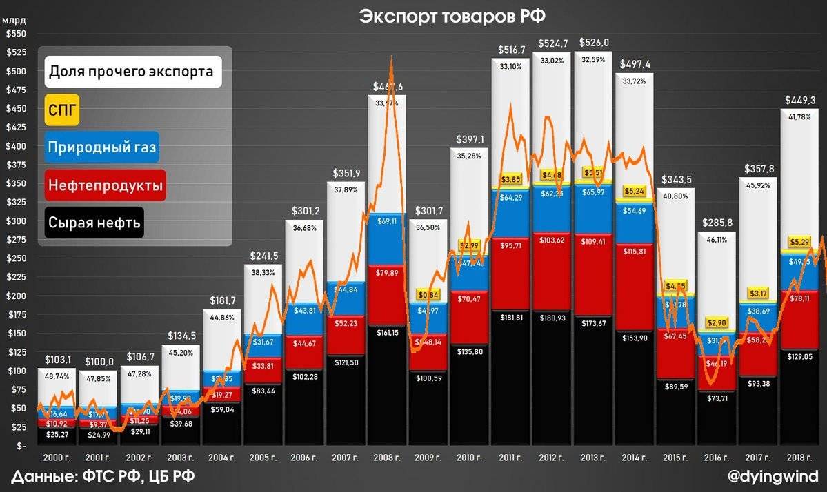Оранжевой линией я наложил котировки нефти. Зависимость более чем очевидная — экспорт и доходы бюджета растут при цене на нефть, тогда как диверсификация при снижении цены черного золота не спасает. За все время доля прочего экспорта ни разу не превысила нефтегазовые доходы, причем паритет был наиболее близок в начале 2000-х — видимо, из-за низкой цены нефти.